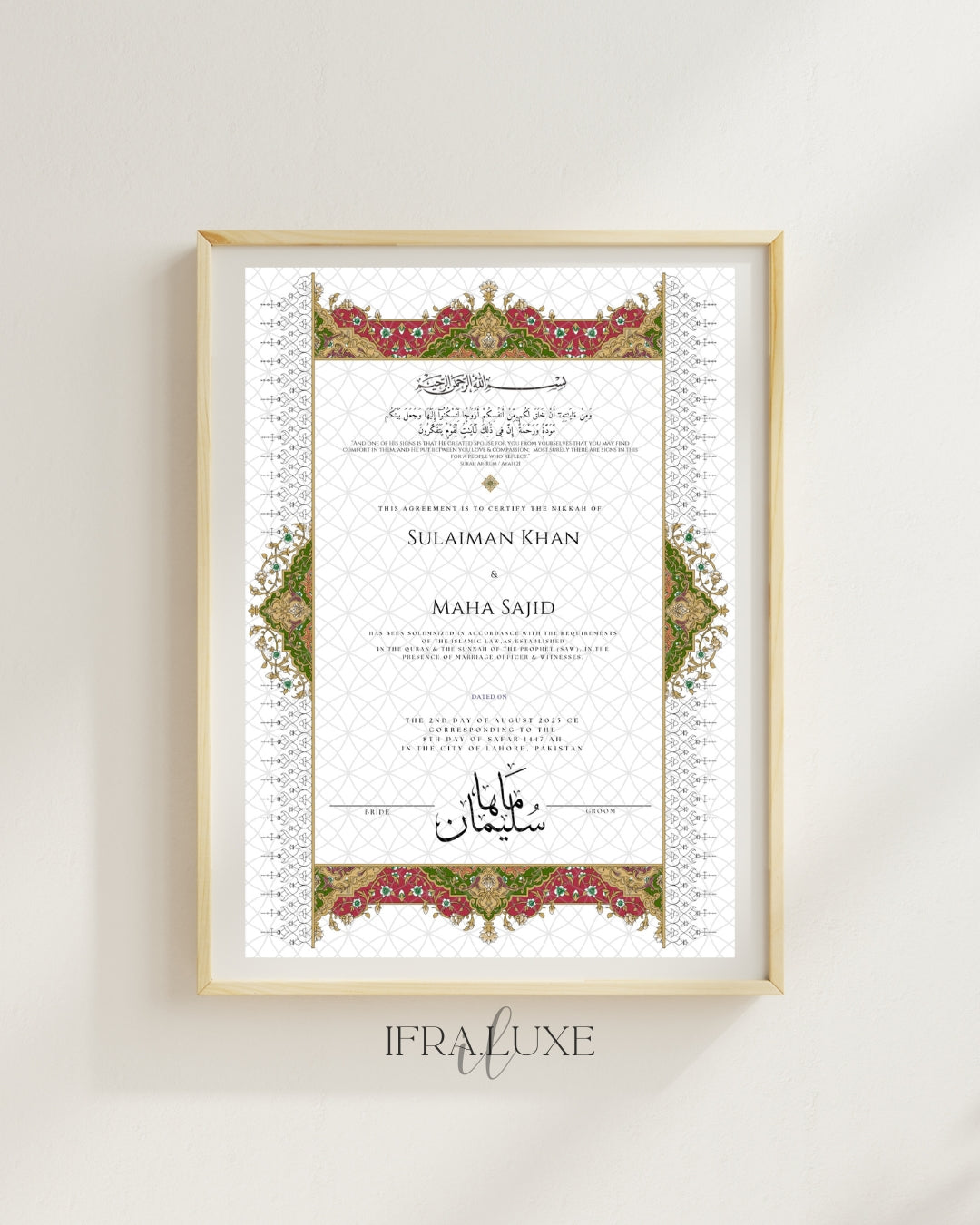 Gold Embellishment: Nikkahnama can also be hand-painted with gold leafing on the names and borders of the design. This luxurious touch is available at an additional cost.
