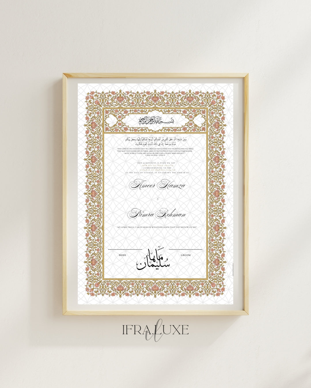 Gold Embellishment: Nikkahnama can also be hand-painted with gold leafing on the names and borders of the design. This luxurious touch is available at an additional cost.
