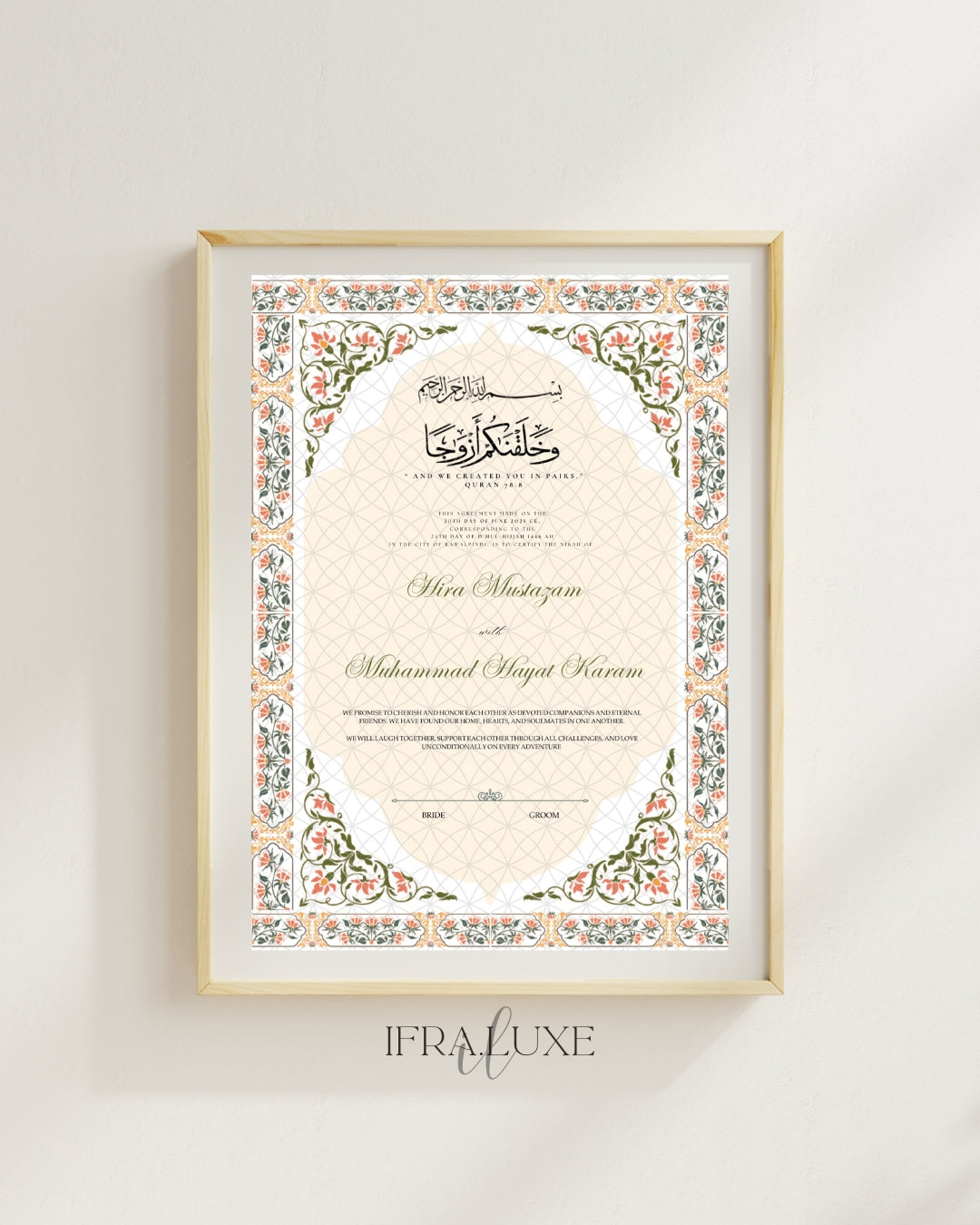 Gold Embellishment: Nikkahnama can also be hand-painted with gold leafing on the names and borders of the design. This luxurious touch is available at an additional cost.