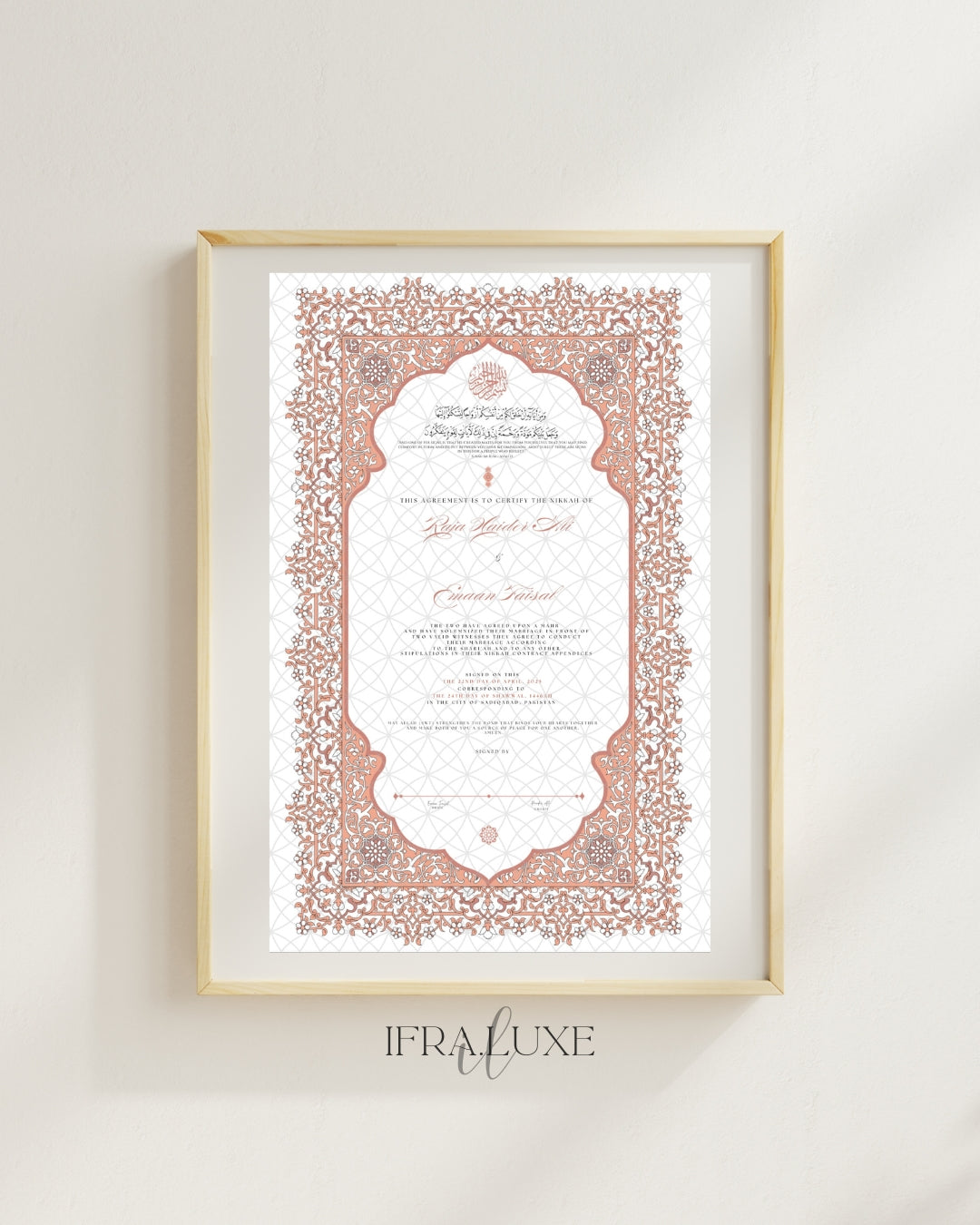 Gold Embellishment: Nikkahnama can also be hand-painted with gold leafing on the names and borders of the design. This luxurious touch is available at an additional cost.