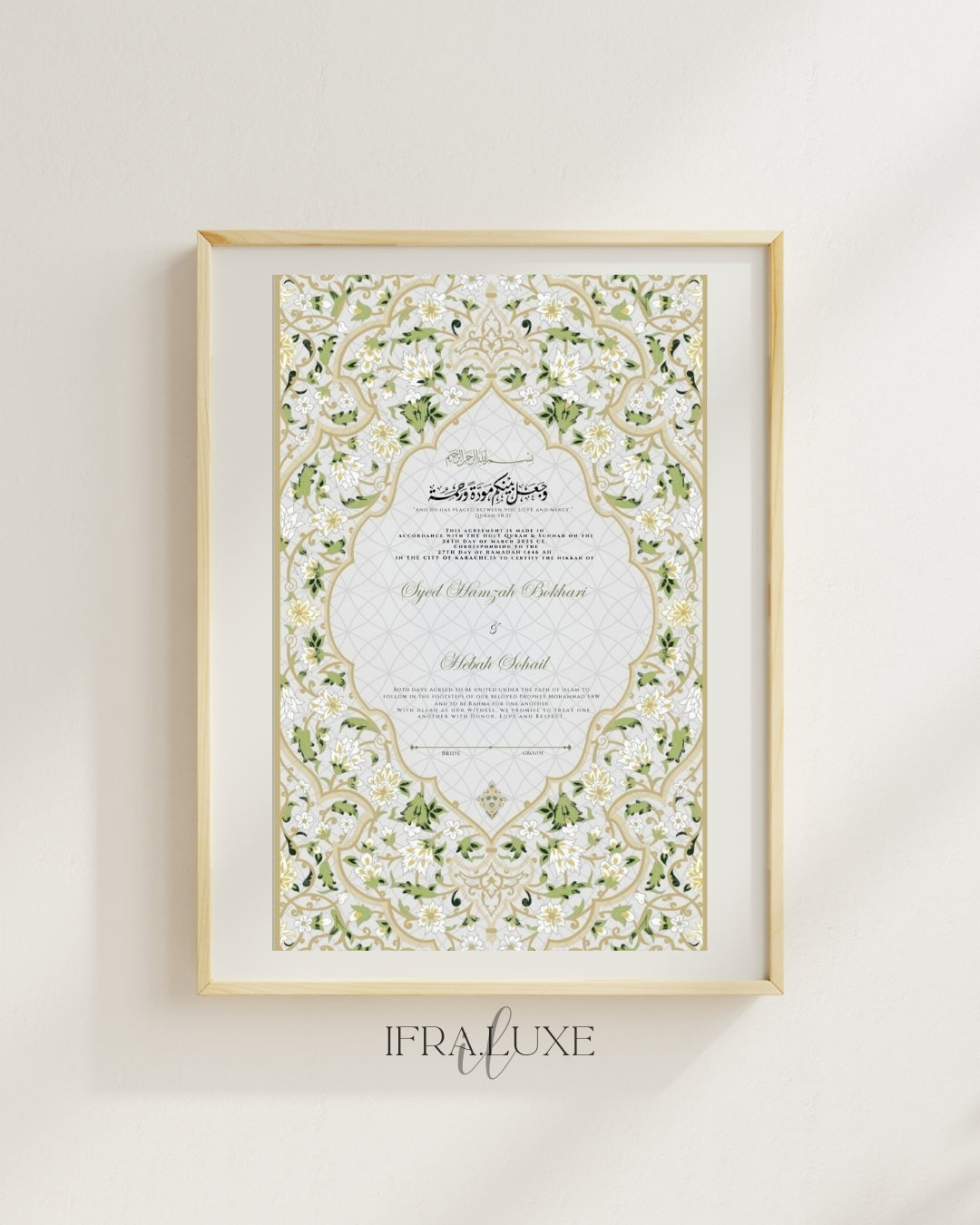 Gold Embellishment: Nikkahnama can also be hand-painted with gold leafing on the names and borders of the design. This luxurious touch is available at an additional cost.