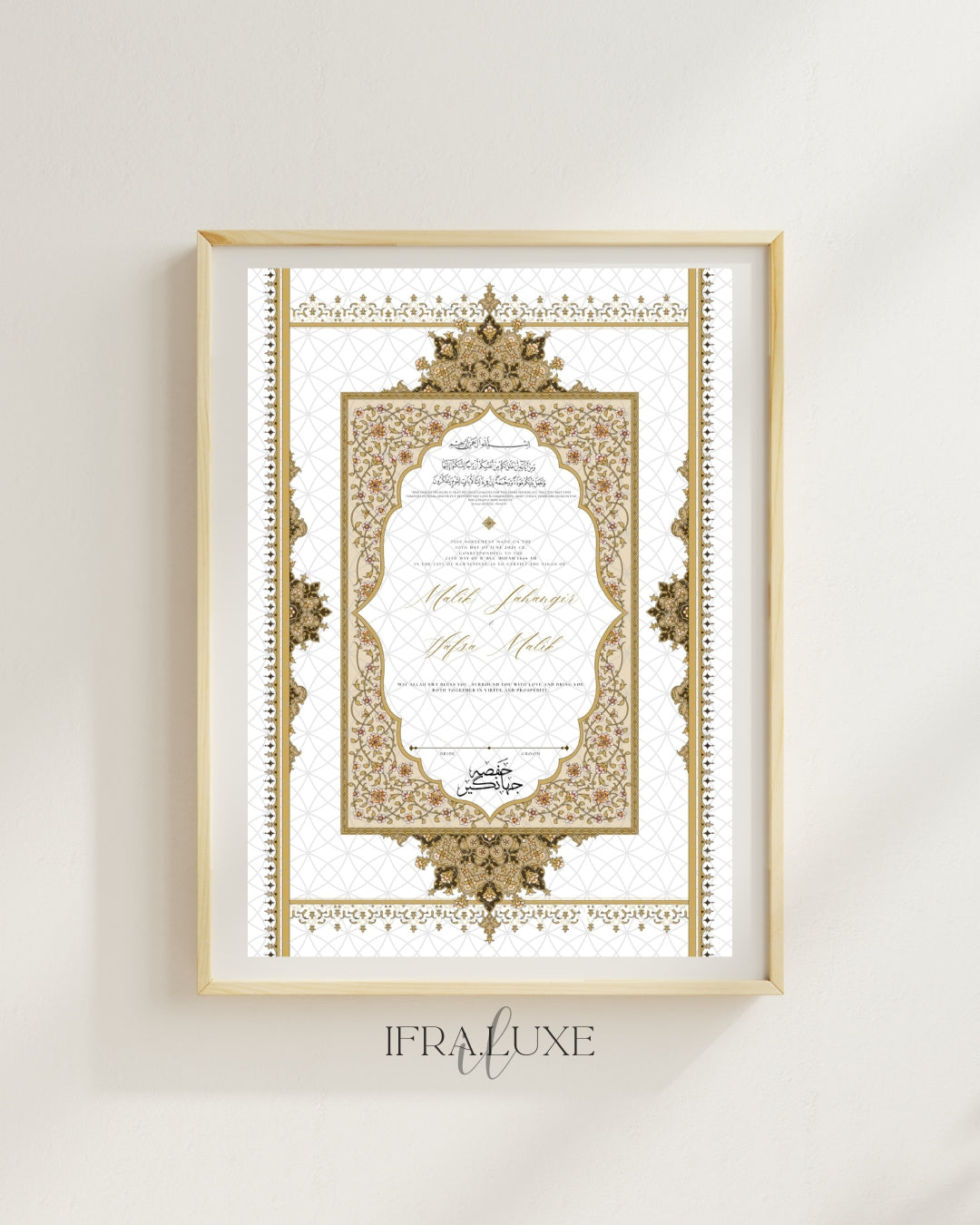 Gold Embellishment: Nikkahnama can also be hand-painted with gold leafing on the names and borders of the design. This luxurious touch is available at an additional cost.