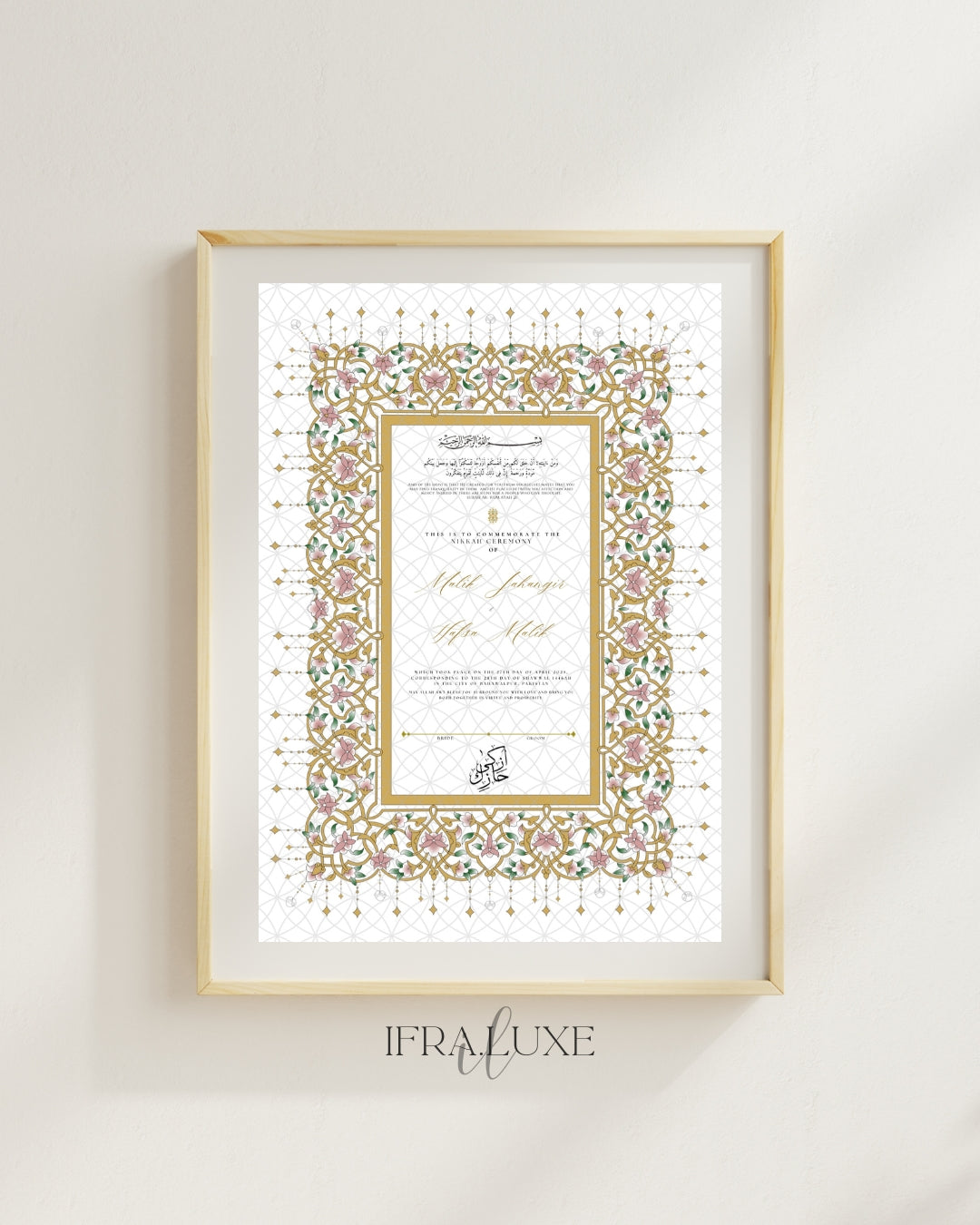 Gold Embellishment: Nikkahnama can also be hand-painted with gold leafing on the names and borders of the design. This luxurious touch is available at an additional cost.