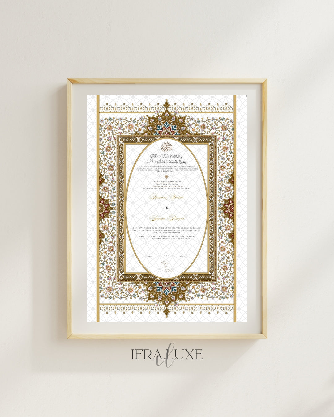 Gold Embellishment: Nikkahnama can also be hand-painted with gold leafing on the names and borders of the design. This luxurious touch is available at an additional cost.