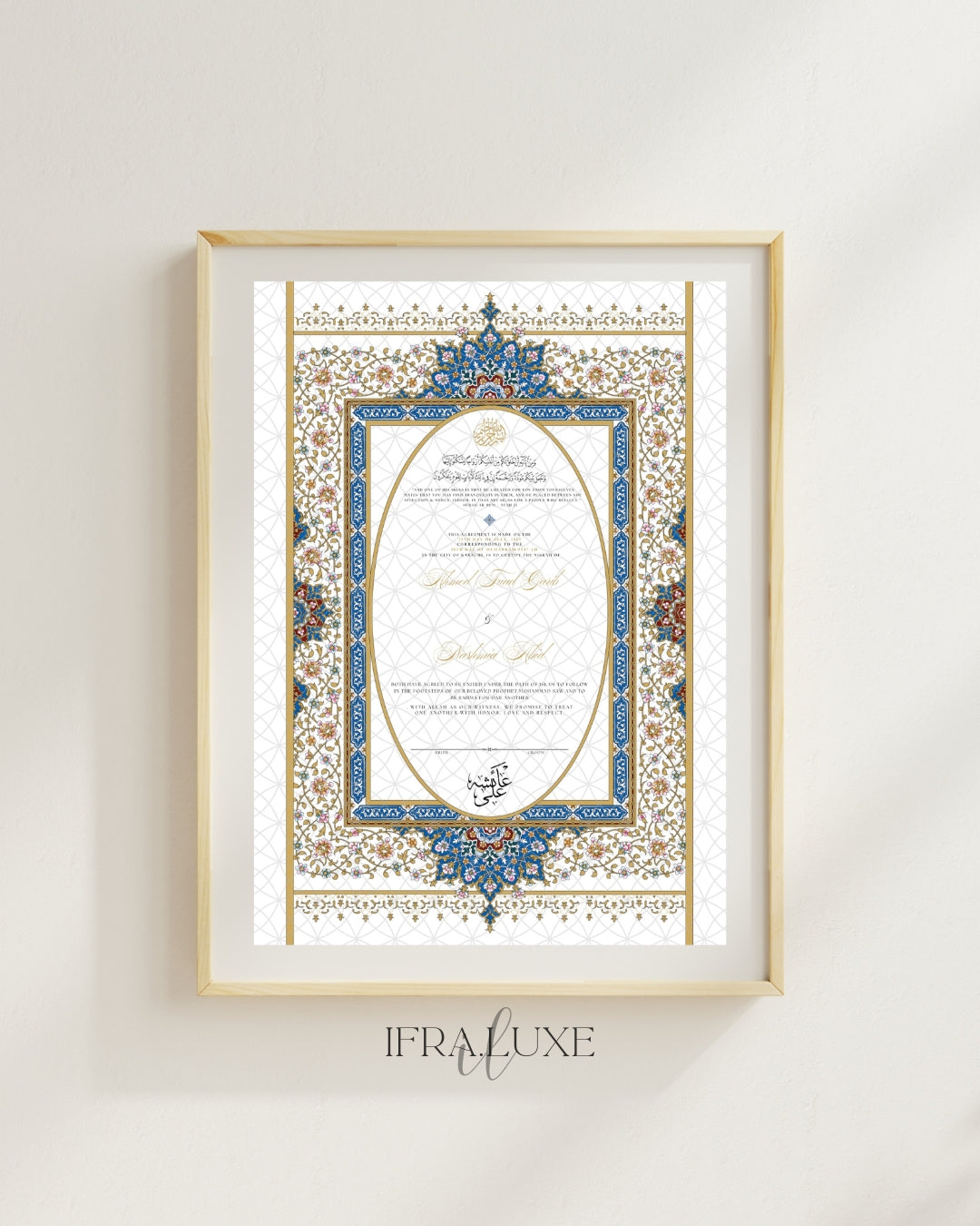 Gold Embellishment: Nikkahnama can also be hand-painted with gold leafing on the names and borders of the design. This luxurious touch is available at an additional cost.