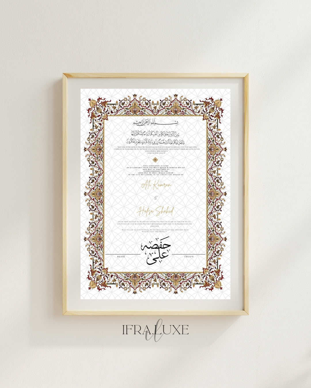 Gold Embellishment: Nikkahnama can also be hand-painted with gold leafing on the names and borders of the design. This luxurious touch is available at an additional cost.
