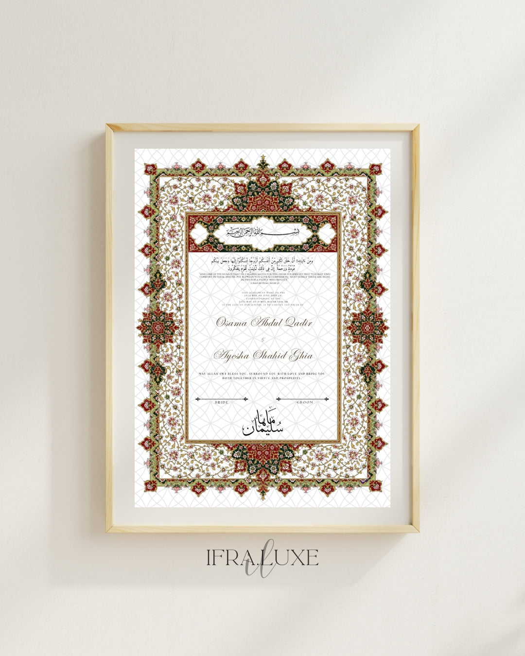Gold Embellishment: Nikkahnama can also be hand-painted with gold leafing on the names and borders of the design. This luxurious touch is available at an additional cost.