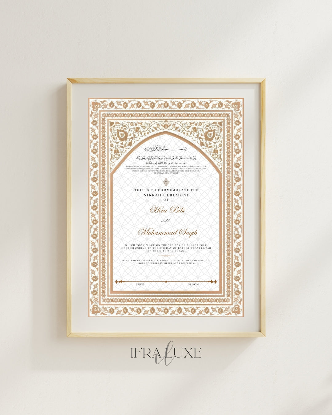 Gold Embellishment: Nikkahnama can also be hand-painted with gold leafing on the names and borders of the design. This luxurious touch is available at an additional cost.